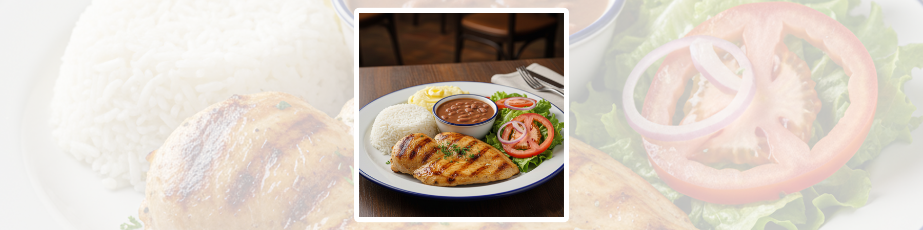 🍗 Frango grelhadoArroz • Feijão • Purê de batata • Salada de alface e tomate